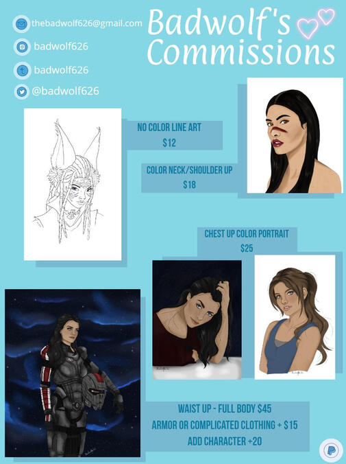 If you are unsure just ask!References: No less than 3 references. The more the better. If you have a pose in mind please send it with your references. If you do not include a pose reference then you are stuck with the one I choose. Face claims work best, if you do not have one, screenshots with multiple angles work best. Please include clothing and details you want and we can discuss if they will cost extra.You will be sent a paypal invoice, then you will receive a sketch to approve, then colors, then no other changes can be made.Please contact me at any of the links above.